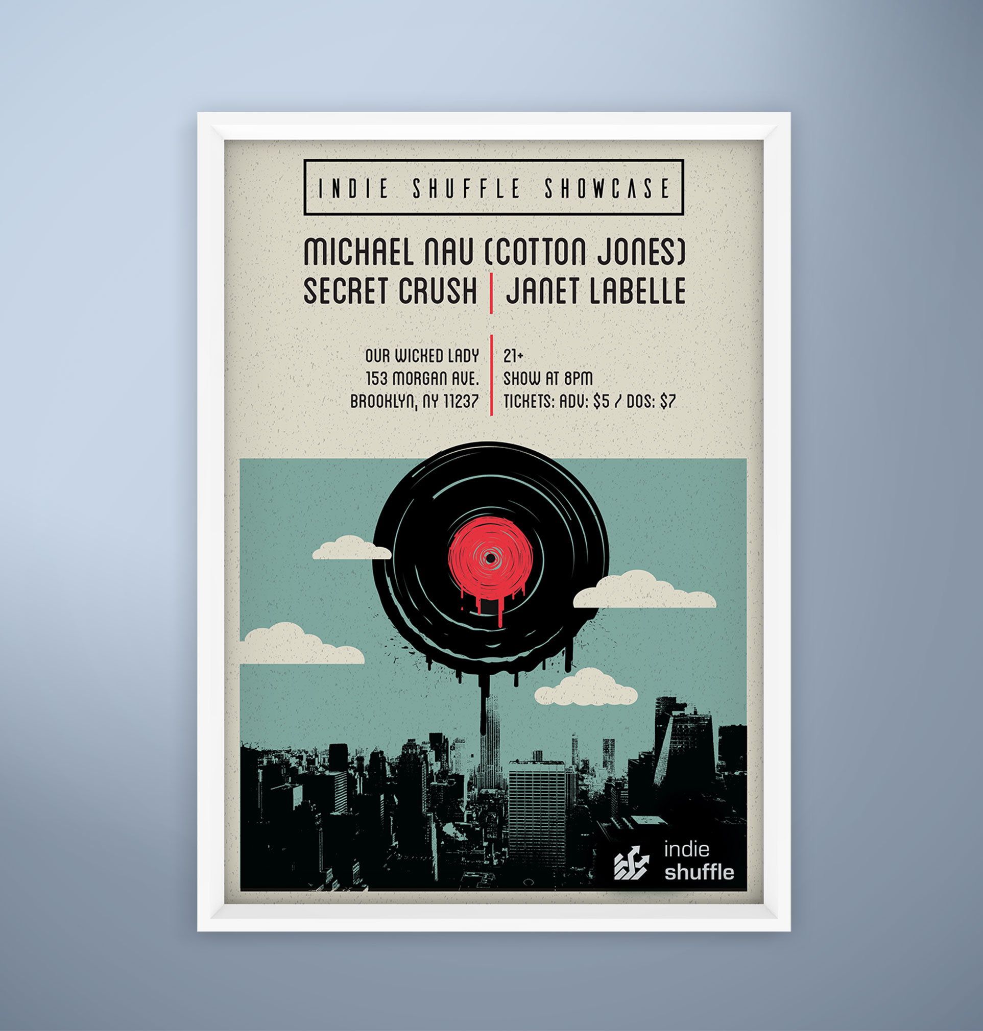 While writing music reviews for Indie Shuffle, an indie music discovery site, I was asked to design a poster for an upcoming show in New York City.