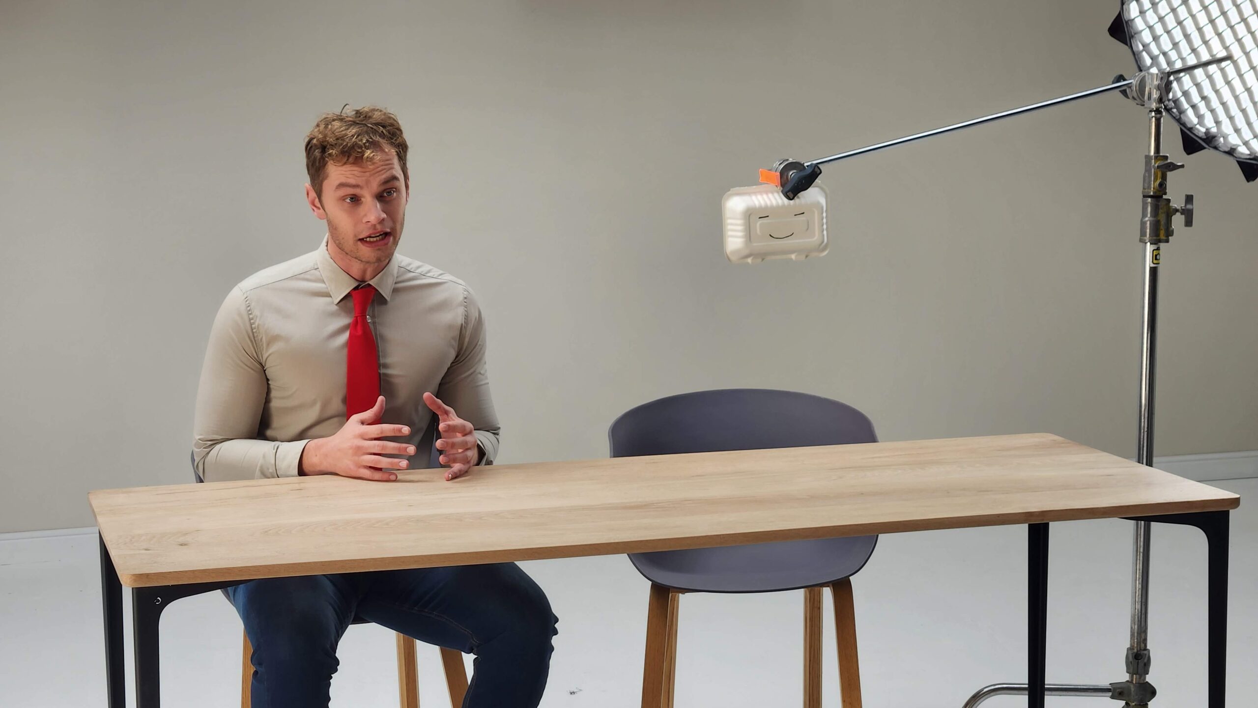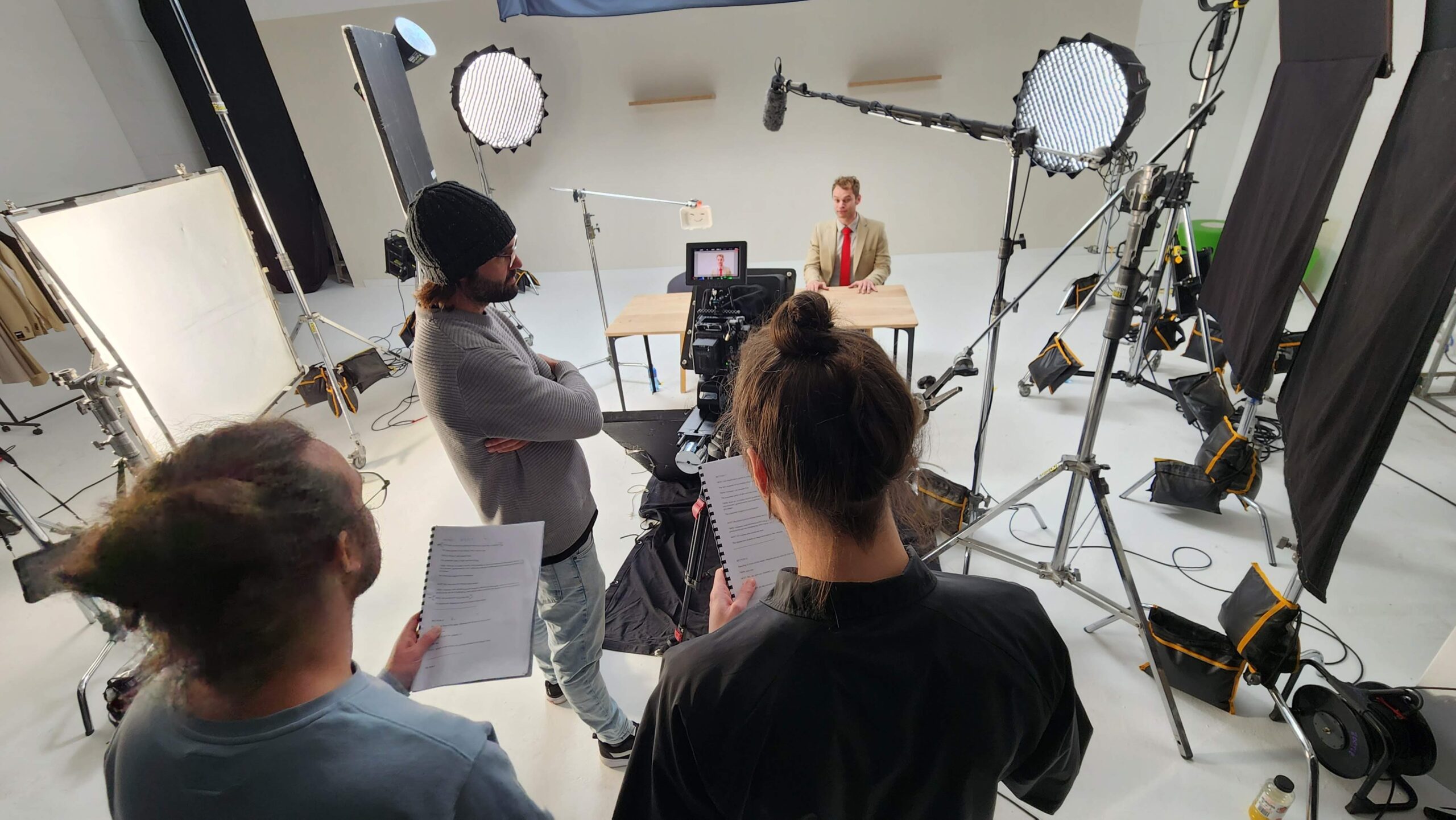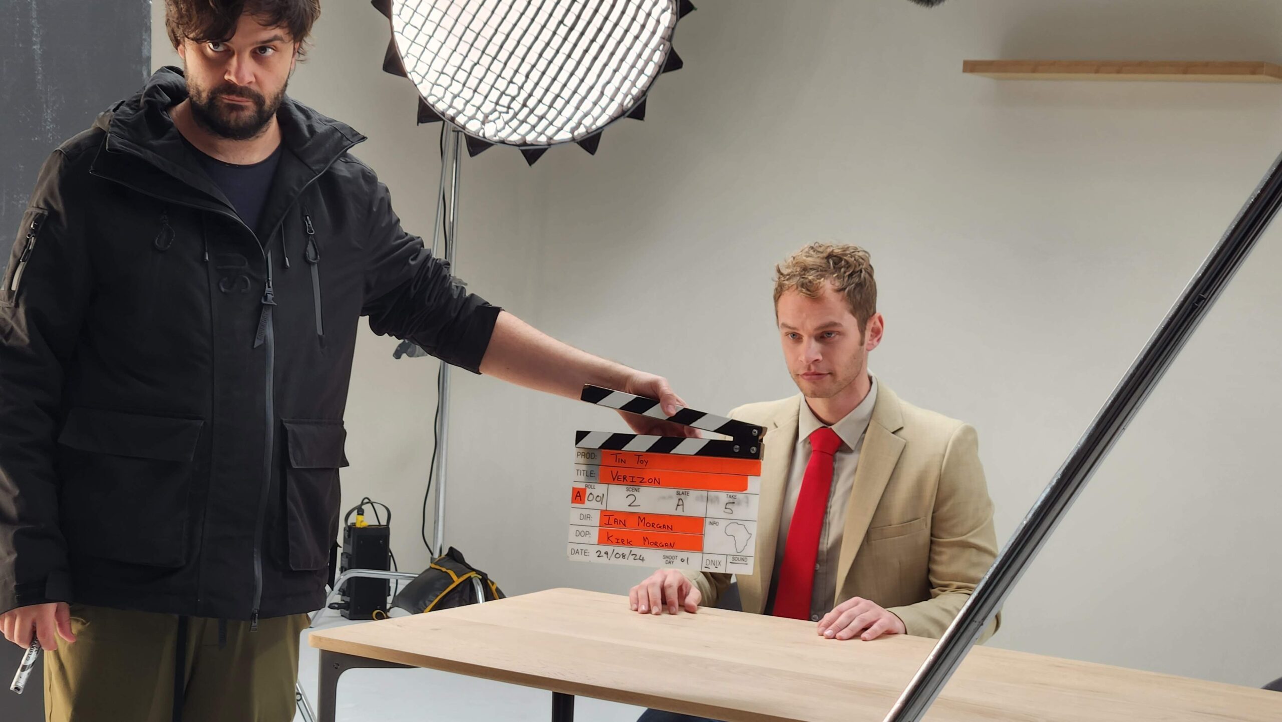 Aidan played both himself and his digital twin. For scenes where the two needed to interact, we used a cardboard cutout of his face as a stand-in to help with eyelines. A simple, clever trick that worked surprisingly well on set. A huge thanks to Tin Toy, who helped us pull off a smart, resourceful shoot that stayed on budget without compromising the idea.