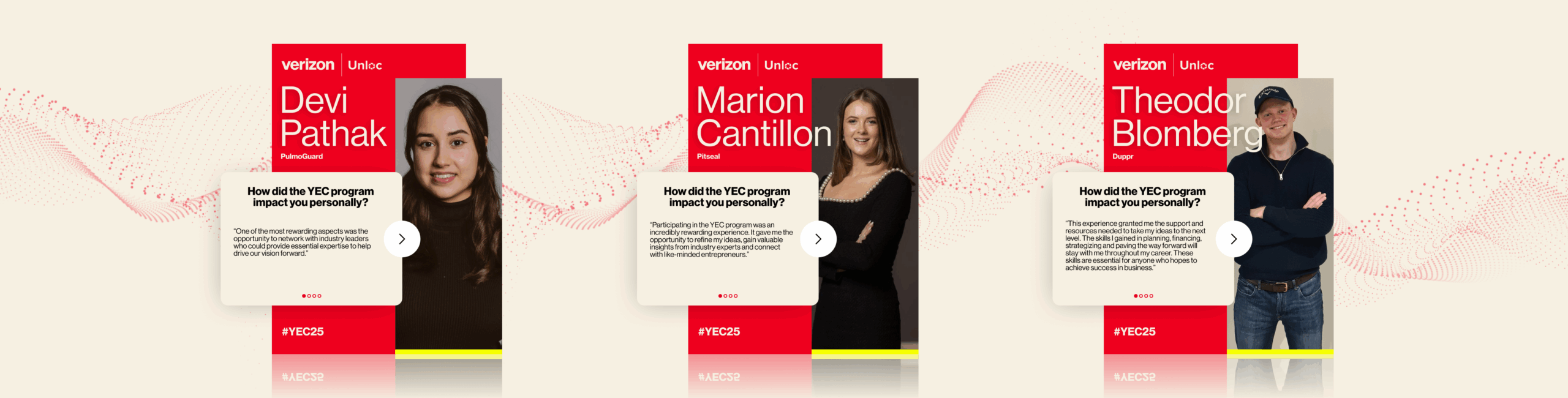 I designed and implemented an interactive wall for the 2025 Verizon Young Entrepreneurs Challenge, an event empowering young innovators to secure funding for world-changing ideas. This projection-based display utilised LiDAR technology to sense hand movements, allowing attendees to intuitively scroll through past winners, explore their groundbreaking products and ideas, get their advice for future candidates, and learn about their experiences with previous events. I worked closely with the technicians to ensure that the design met precise specifications so that it functioned well and everything was legible.